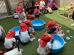 日差しが熱くなってきたので園庭で水遊びをしました。
